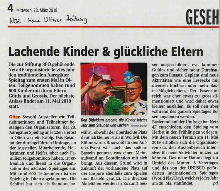 Der Aaregäuer Spieltag hat Tradition. Die zur Stiftung 3FO gehörende Netz 4F organisiert am 11. Mai 2019 die 21. Ausgabe zum 2. Mal in der Schützi in Olten. Unter dem Motto «Der Aaregäuer Spieltag auf Entdeckungsreise – Wir reisen, spielen und basteln um die Welt» werden gegen 600 Kinder, ihre Eltern, Göttis oder Grosis und die Liedermacher Christian Schenker aus Kappel und Uwe Lal aus Schalksmühle erwartet.